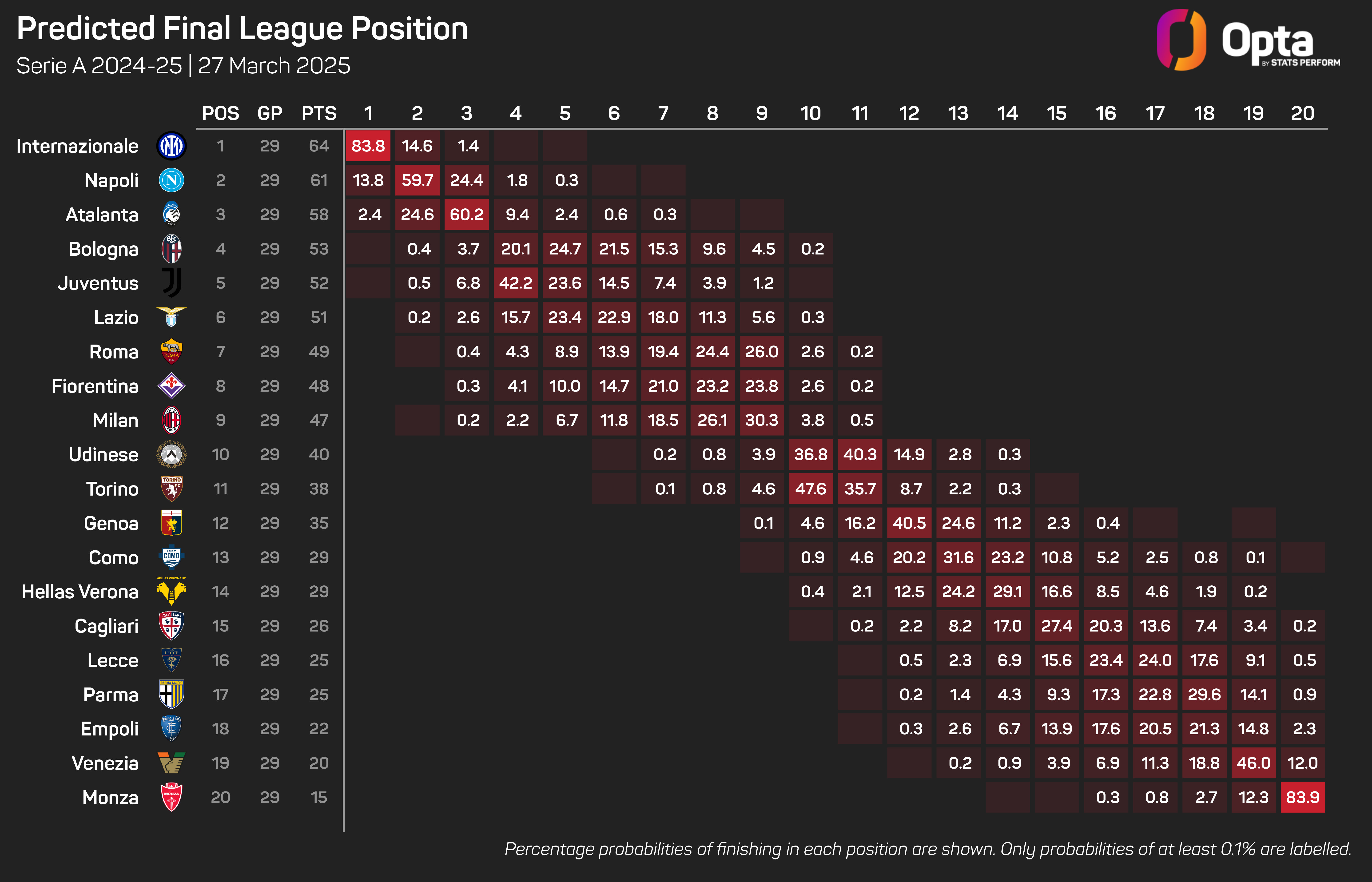 According to the Opta supercomputer, Juventus are most likely to finish fourth (42.2%), but overall, have a 49.5% chance of finishing in the top four.