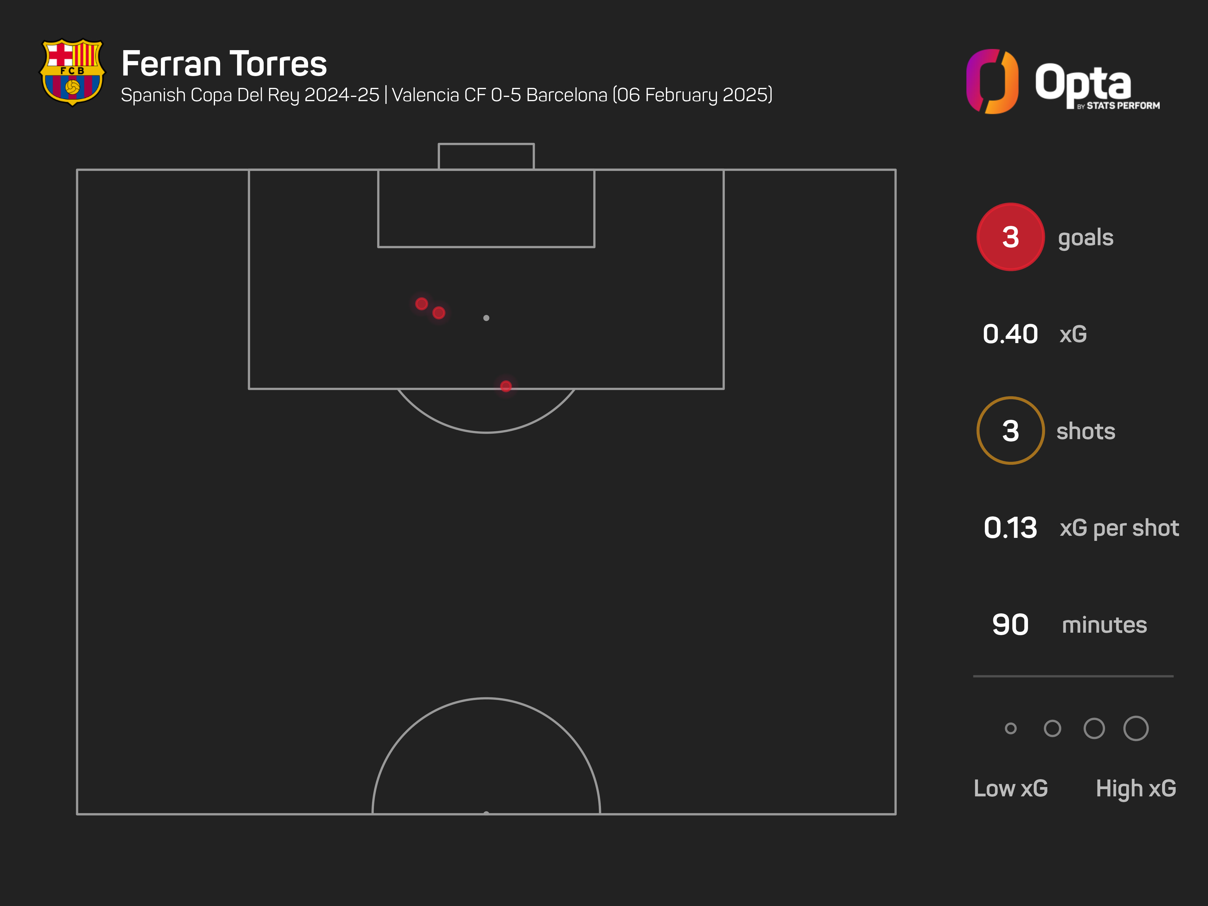 With his third goal being timed at 29 minutes and 10 seconds, Torres scored Barcelona's fastest hat-trick in any competition since October 2008.