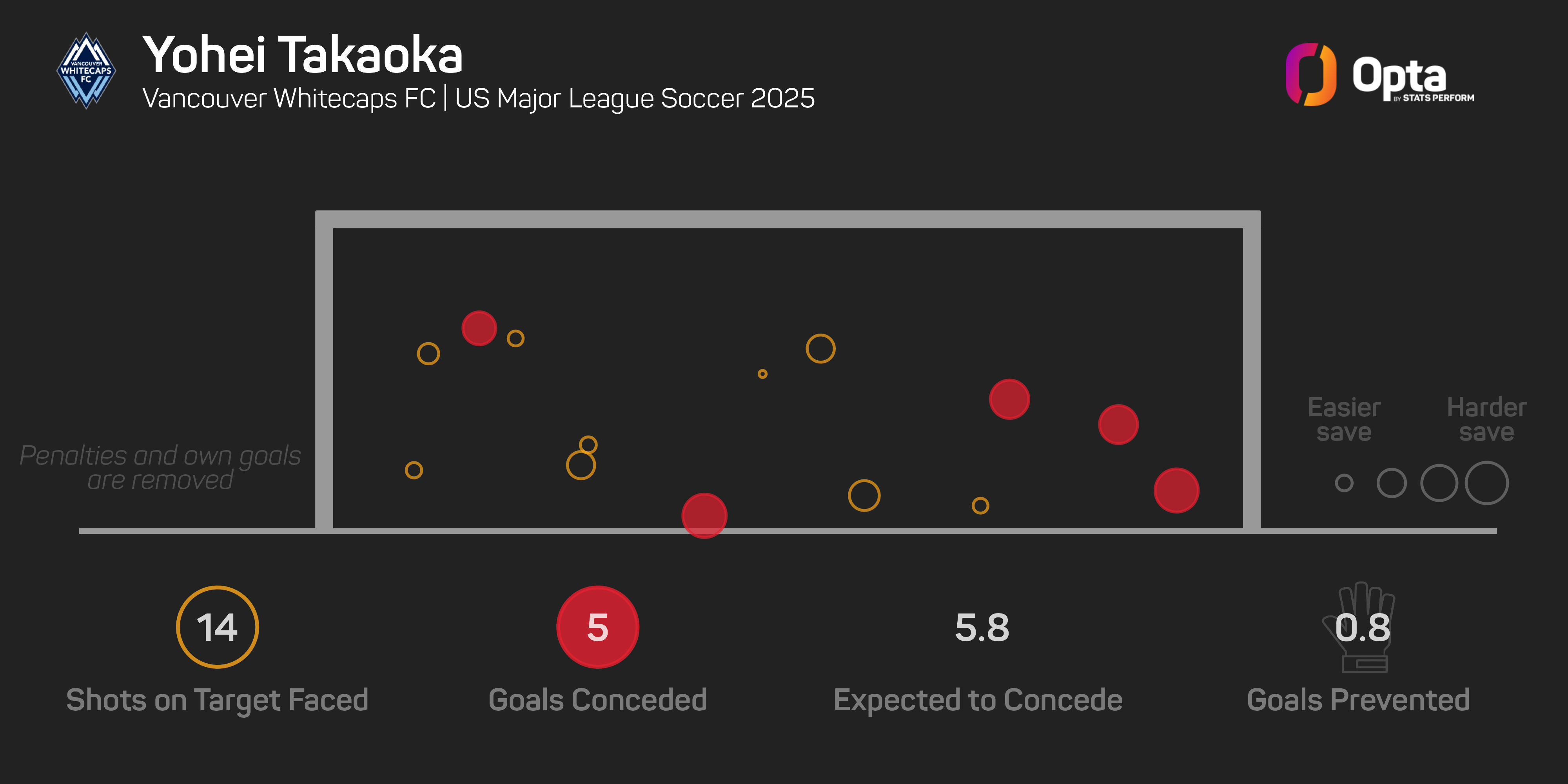 Yohei Takaoka has prevented 0.8 goals according to the expected goals on target model (xGoT) and conceded just five goals. Only two teams across MLS have let in fewer goals.