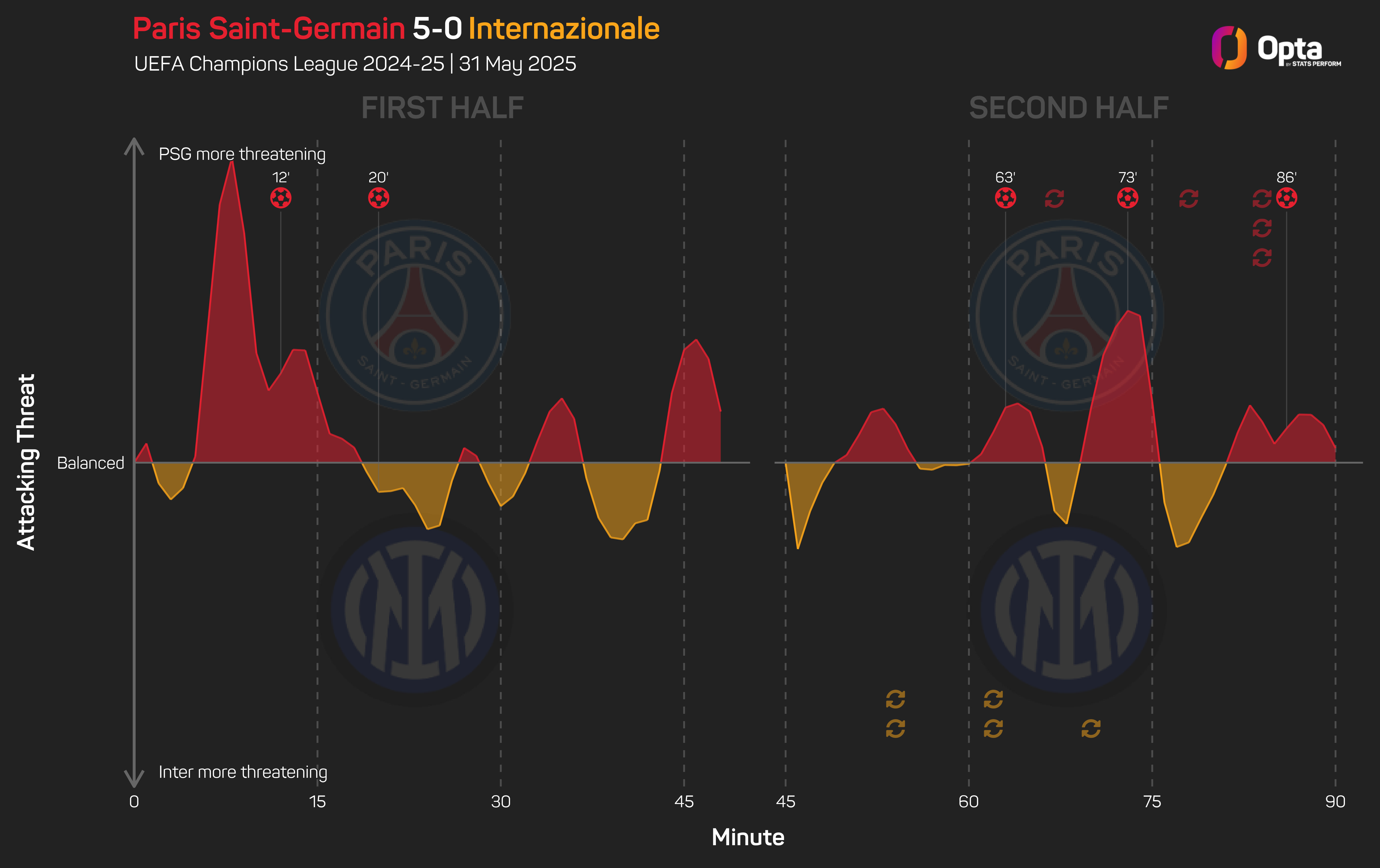 PSG, who fielded a starting lineup with the third-youngest average age ever in a Champions League final at 25 years and 96 days, became the first team since 1962 to score five goals or more in a Champions League/European Cup final.