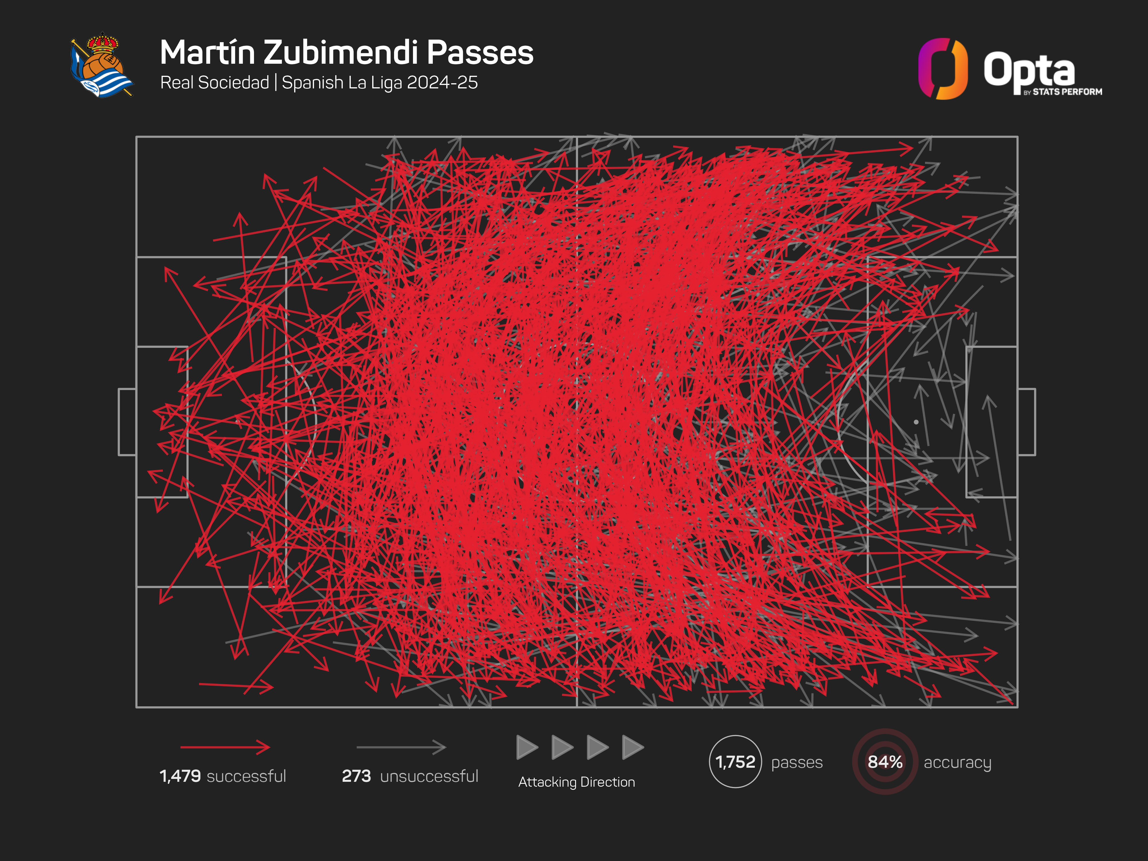 In 36 league appearances last season, Zubimendi attempted 1,752 passes and completed 1,479, with 321 of his successful passes ending in the final third.